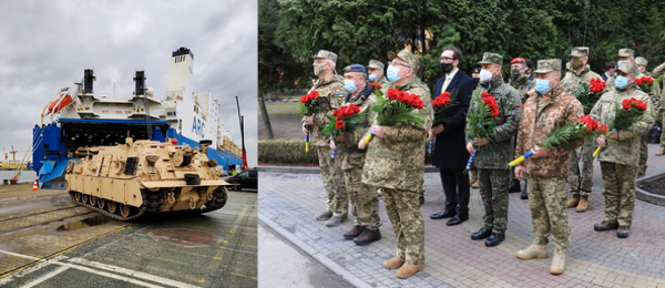 Left: US tanks arrive for NATO exercise Defender 20, US led exercises bringing 20.000+ troops to the border of Russia. Right: NATO Military Committee Chairman visits Ukraine, April 2021